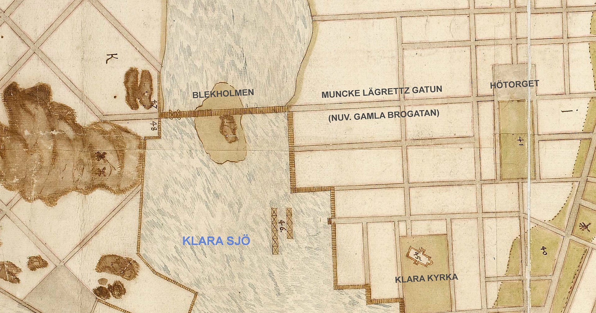 Del av en dansk Stockholmskarta från 1640-talet visande Gamla Kungsholmsbron och Munkelägrets gatans sträckning.